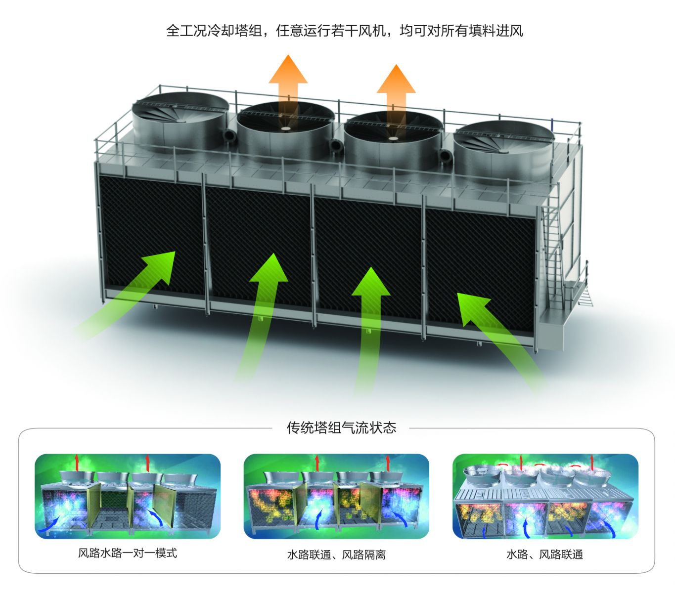 彻底解决了传统冷却塔 组在系统流量较低时水力分布不均匀的问题