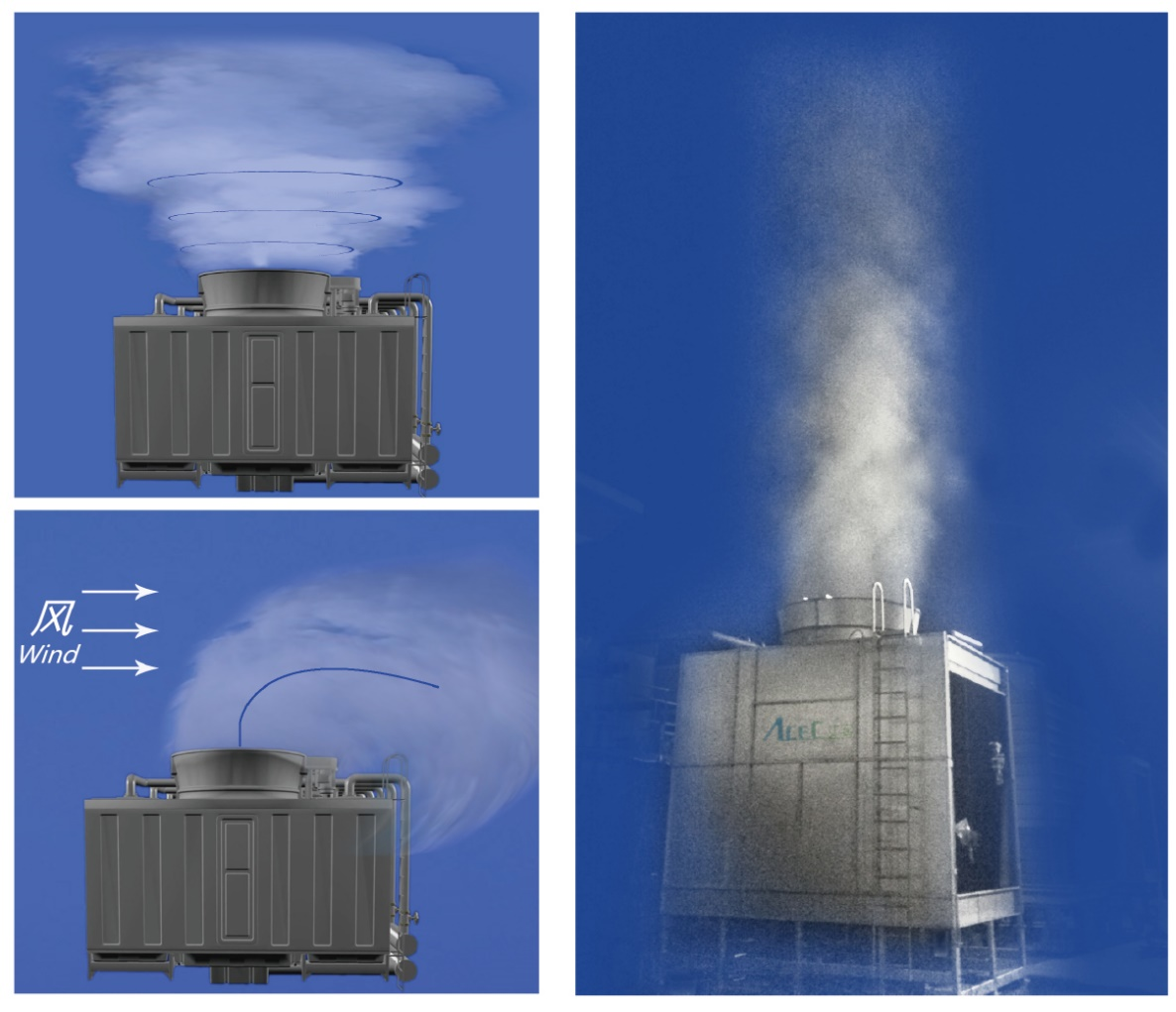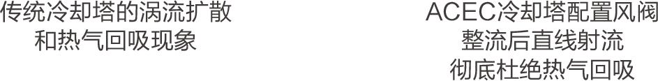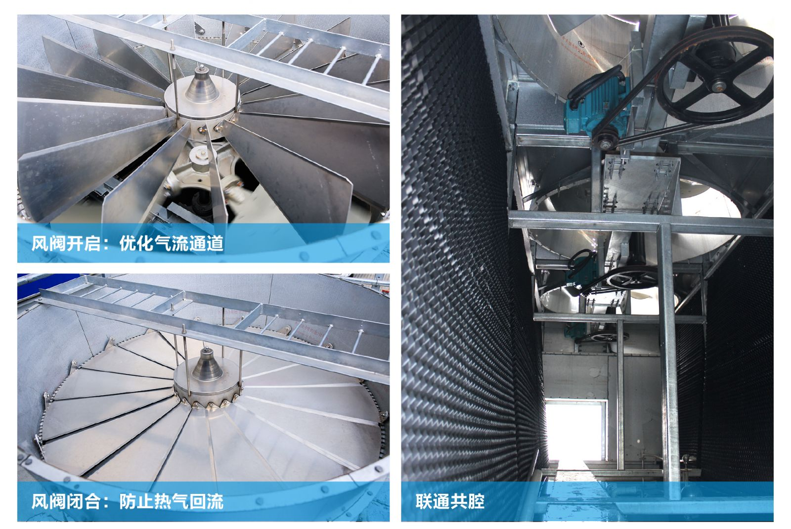 艾客"全工况"冷却塔组采用全联通风路共腔设计。每个风机出口处可配置的“自力式整流止回风阀”(自主知识产权4),风阀随风机运行状态自动开启闭合,实现塔组一体共腔。优化流场分布并提升出风压力与射速;实现了塔组随系统散热负荷需要,有效利用所有填料,通过调节风机模块运行数量,实现高效节能运行。